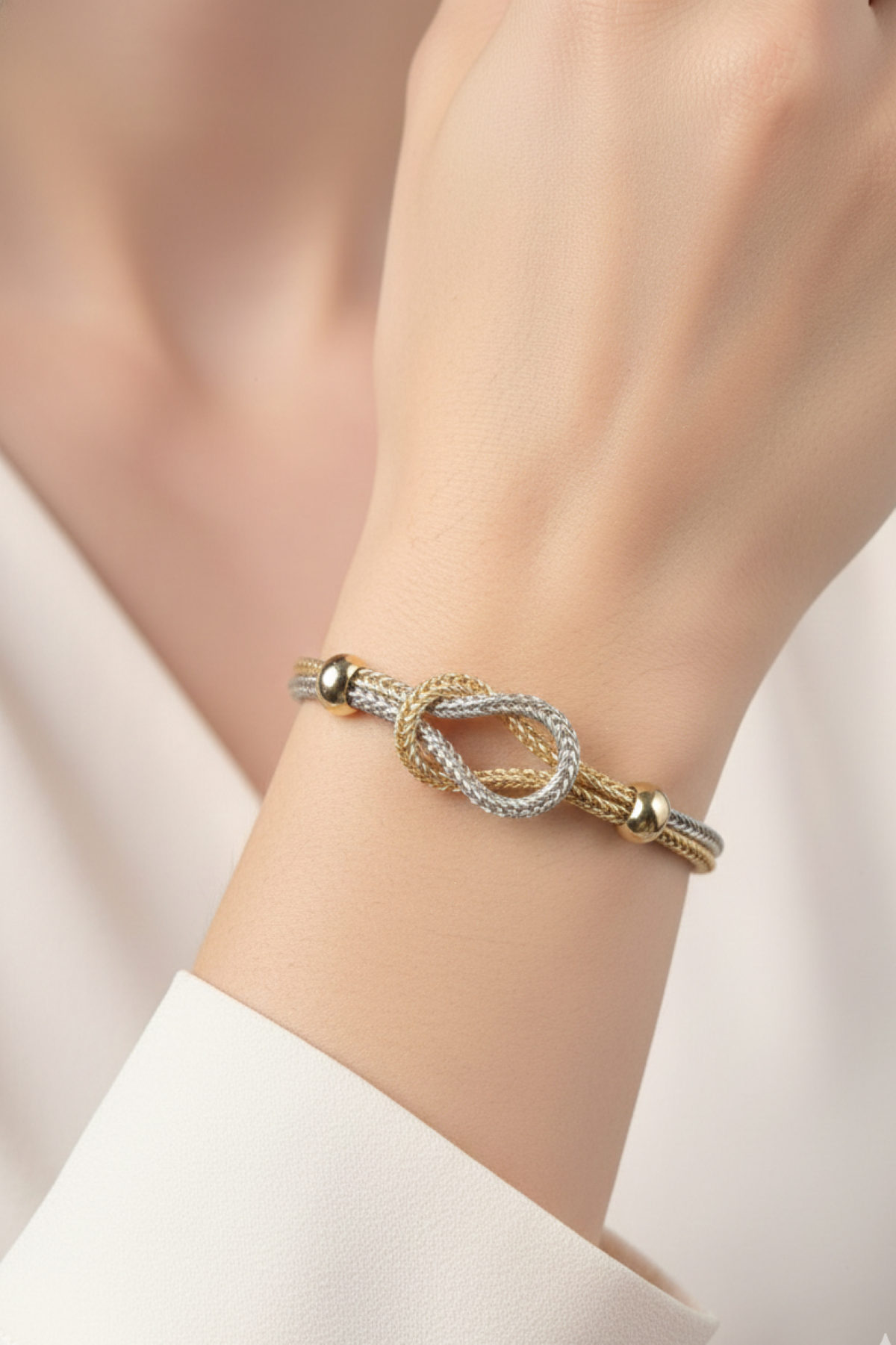 Det sirkulære tauknute-designet gir armbåndet et iøynefallende og eksklusivt preg. De doble kjedene skaper en fin balanse mellom styrke og eleganse, samtidig som den justerbare lengden på 15 cm + 5 cm gjør at armbåndet passer de fleste håndledd. Elara er lett og komfortabel å ha på, og detaljene i flettingen gir smykket en unik karakter.